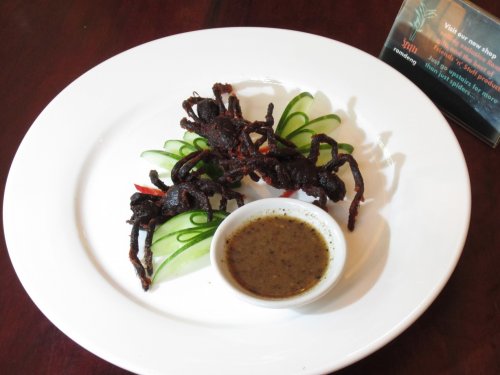 В Камбодже вы можете отведать жареных тарантулов. Они очень дешевы и вкусны. Если вы не страдаете арахнофобией и обладаете крепкими нервами, то обязательно попробуйте этот деликатес. Изначально традиция есть тарантулов зародилась во времена правления красных кхмеров, которые вынуждали местное население питаться тарантулами. С тех пор привычка прижилась, к тому же это оказалось довольно вкусным блюдом.