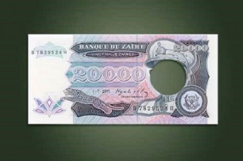 В 1997 году люди африканской страны Заир (на данный момент Демократическая Республика Конго) свергли тоталитарный режим президента Жозефа Мобуту (Joseph Mobutu). Однако, из-за того, что у нового правительства не было достаточно новой валюты, они решили использовать старые купюры 20000 Заира с вырезанным портретом Мобуту.