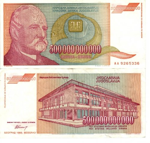 Югославия пережила безудержную инфляцию с 1989 года по 1994 год, когда были проведены реформы денежных единиц. Самый высокий номинал в 1988 году была купюра в 50000 динаров, но к 1994 году самой ценной стала купюра в 500 000 000 000 динаров.