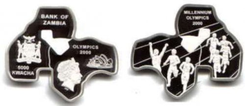 Эта странно выглядящая монета, содержащая приблизительно 31 грамм серебра, была впервые выпущена в честь Олимпийских Игр в Сиднее 2000 года. Её необычная форма на самом деле является сочетанием карт Австралии и Замбии, что достаточно сложно определить, так как обе страны представлены в одинаковом размере. Размеры самой монеты составляют 4,8 см на 4 см