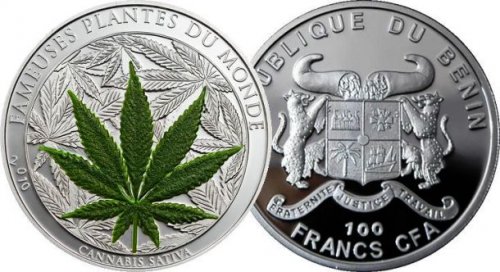 Первая в мире серебряная монета с марихуаной была выпущена по приказу правительства западноафриканской Республики Бенин. На обратной стороне был изображён ярко-зелёный лист конопли посевной, который если потереть, испускал отчётливый запах марихуаны благодаря синтетическим добавкам.