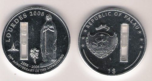 В честь 150-летия явления Девы Марии святой Бернадетте в Лурде (St Bernadette at Lourdes), юг Франции, в 2008 году Республика Палау (западная часть Тихого океана) выпустила памятную монету. В ней есть пипетка с настоящей водой из Лурда.