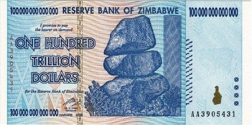 Гиперинфляция в Зимбабве началась вскоре после конфискации личных подсобных хозяйств у белых землевладельцев, к концу причастности Зимбабве ко Второй конголезской войне (Second Congo War) (1998 - 2003 годах). Пик инфляции оценивался в 79600 миллионов процентов в ноябре 2008 года. В то время Национальный банк выпускал банкноты с достоинством, достигающим 100 000 000 000 000 долларов.