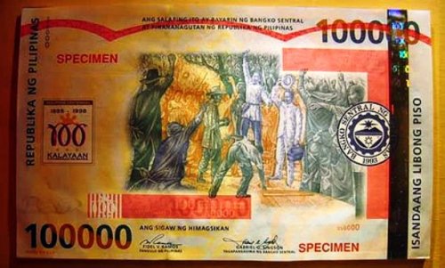 Купюра была выпущена Центральным Банком Филиппин (Central Bank of The Philippines) в честь празднования Столетия Филиппин (Philippine Centennial Celebration) в 1998 году. Книга рекордов Гиннесса признала купюру шириной 21,5 сантиметра и длиной 35,5 сантиметра как самую крупную банкноту, используемую в качестве законного средства платежа.