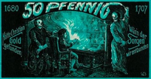 Немецкие деньги для чрезвычайных ситуаций часто иллюстрировались местными художниками. Изображения на банкнотах включали в себя различные темы от романтического фольклора до социальной сатиры, оставляя позади культурное наследие этого периода в истории Германии. Страшные дизайны, такие как на этой банкноте в 50 пфеннингов, не стали исключением.