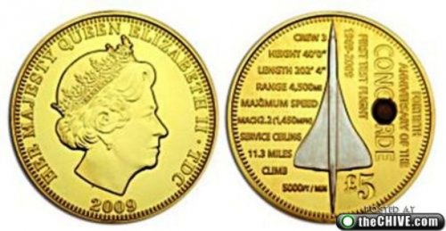 Тристан-да-Кунья, территория, занимающая удалённые вулканические острова на юге Атлантического океана, выпустила специальную серию монет в честь двадцатилетия Конкорда в 2009 году. Монеты покрыты золотом и каждая из них содержит маленький кусочек титанового сплава головного обтекателя Конкорда.
