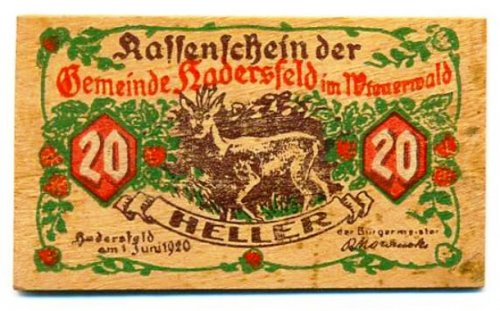 Германия погрузилась в глубокий финансовый кризис после Первой мировой войны, что привело к тому, что немцы начали печатать свою собственную форму неофициальной валюты, известной как «Notgeld» (в переводе с немецкого языка означает «деньги для чрезвычайной ситуации»). Города печатали валюту на всём, от дерева и алюминиевой фольги до игральных карт, в попытке обойти обесценившуюся стоимость немецкой марки.