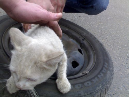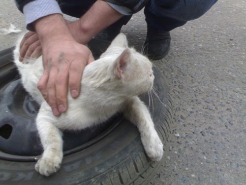 Всю дорогу счастливчик, скорее всего, просидел в районе коробки передач или усилителя тормозов. Когда девушка обратилась к работникам шиномонтажа, самостоятельно выбраться он уже не мог. Мужчины задомкратили машину, сняли колесо, немного отвели в сторону защиту и вытащили бедолагу.