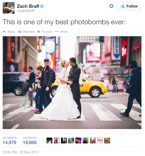Нью-Йоркский фотограф Саша Райнкинг широко известен благодаря фото молодоженов, сделанных на оживленных городских улицах. Когда в ноябре 2013 года к нему обратилась пара, попросившая заснять их свадьбу в Нью-Йорке, он не был удивлен. Райнкинг попросил пару встать на 42-й улице неподалеку от Таймс-сквер. Вечером того же дня, когда он рассматривал полученные снимки, Райнкинг заметил парня в кепке, который попал в кадр. При ближайшем рассмотрении им оказался Зак Брафф, звезда сериала «Клиника». Чтобы подтвердить свою догадку, Райнкинг скинул Браффу фото в Твиттере со следующими словами: «Сэр, мне кажется, вы засветились на фото моей парочки молодоженов в Нью-Йорке. Удачное фото». На что Брафф ответил твитом: