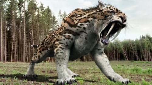 Смилодон, эндемичный Северной и Южной Америкам бродил по земле в эпоху Плейстоцена (2,5 миллиона – 10 000 лет назад). Он является самым лучшим известным примером саблезубого тигра. Это был крепко сложенный хищник с особенно хорошо развитыми передними конечностями и исключительно длинными и острыми верхними клыками. Самый крупный вид мог весить до 408 килограммов.
