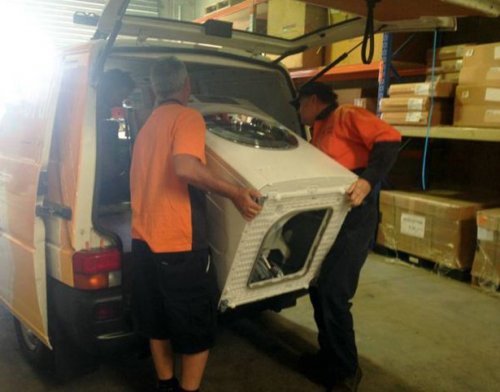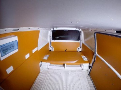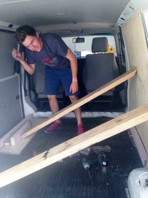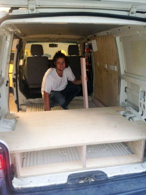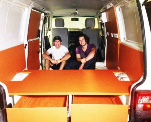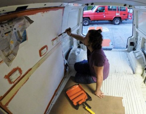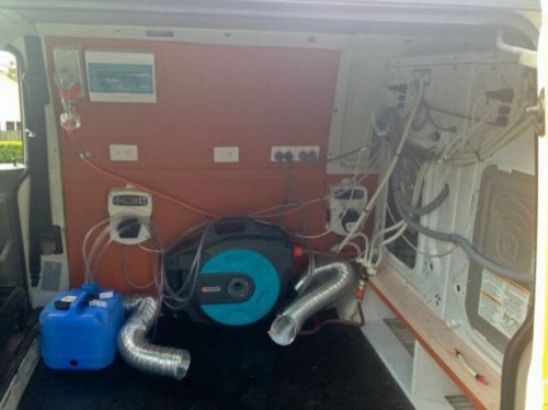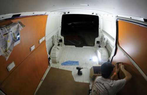 Они начали с того, что полностью очистили фургон, чтобы установить все компоненты и крепления для стиральных машин.