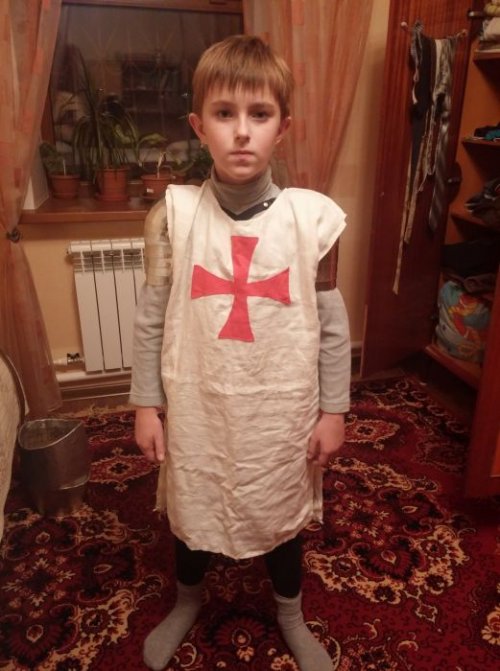 Одними из самых популярных персонажей на школьных утренниках являются герои сказок и фантастических фильмов. Суперменом сейчас уже никого не удивишь, тем более что в магазинах можно купить уже готовый костюм. А вот сын этих родителей очень хотел иметь костюм рыцаря времён Крестовых походов, в чём ему не было отказано. Вооружившись нержавеющей жестью толщиной 0,3 мм, клеем, вытяжными заклёпками, клепателем и тканью, мама с папой сделали ему практически настоящий костюм рыцаря.
