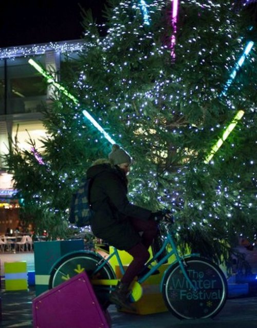 Для начала давайте обозначим самый очевидный способ. В мире существует огромное множество новогодних ёлок, чьи гирлянды подпитываются электроэнергией от педального привода, но эта ёлка расположена в Королевском фестивальном зале (Royal Festival Hall) на Южном Берегу Лондона (London’s South Bank). Покрутить педали для освещения ёлочки может абсолютно каждый, кто захочет. Просто запрыгивайте, начинайте крутить педали и вбирайте в себя праздничное настроение!
