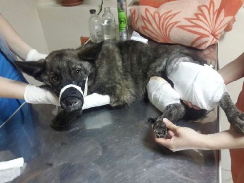 Ветеринары предложили усыпить доставленного пса, однако фонд настоял на спасении животного и проведении необходимой операции. Как оказалось, у него были переломаны задние лапы в семи местах, а также сломан крестец. Операция длилась в течение 8 часов, выставленный ветклиникой счёт составил 15.000 рублей. Операцию делали в долг, пока деньги на её оплату поступали на счёт фонда от неравнодушных Интернет-пользователей.