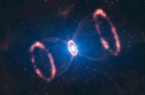 Последствие недавно взорвавшейся звезды, известной как Сверхновая Звезда 1987A (Supernova 1987A) создала такую форму песочных часов из выброшенной за пределы Туманности Тарантул (Tarantula Nebula) материи. Это случилось на расстоянии приблизительно 168 000 световых лет от Земли, достаточно близко, чтобы увидеть невооружённым глазом.