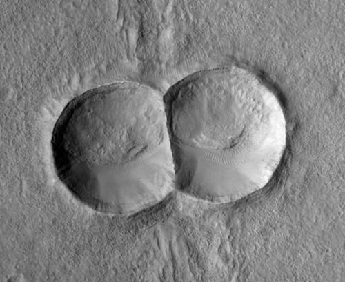 И ещё одно образование, расположенное на Марсе. Однако на этот раз у нас пара кратеров, созданных одним объектом, который раскололся напополам, войдя в атмосферу Марса. Этот кратер не просто выглядит как клетка, проходящая через митоз, если приглядеться, то вы даже сможете увидеть то, что похоже на центромеру и веретенообразные волокна клетки.