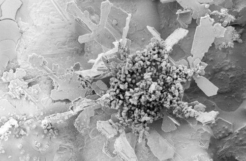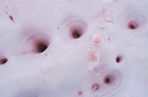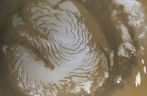 Однако марсианский снег на самом деле достигает поверхности, особенно вокруг полюсов. На фотографии выше показан Северный полюс Марса. Этот снег – не вода. Это замороженный углекислый газ. Кристаллы являются микроскопическими, вероятно размером с красные кровяные тельца. Они выпадают как туман. Сухие и порошкообразные частицы не склеиваются в снежный ком, но это была бы мечта лыжника. В редких случаях, вода-лёд всё же выпадает и на Марсе.