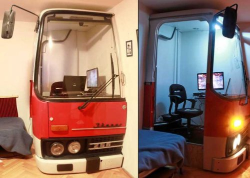 Вы должны по-настоящему любить автобусы, чтобы установить один из них в своей квартире, и, более того, сделать его своим офисом