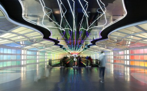 Если вы когда-либо путешествовали по Соединённым Штатам Америки, у вас скорее всего была пересадка в великолепном аэропорте О’Хара в Чикаго. Это один из самых загруженных аэропортов в мире и является раем любителей дизайна, благодаря великолепной разноцветной световой инсталляции, расположенной между терминалами. Каждые несколько секунд установка, от которой невозможно оторвать взгляд, изменяет цвет и направляет свет в различные направления. Аэропорт настолько большой, что в нём существует высокотехнологичный легкорельсовый транспорт, связывающий различные части аэропорта, позволяя во время переезда даже увидеть внешний вид аэропорта. Если вам хочется размяться, посетите недавно открывшийся зал йоги. Вы также можете купить пропуск на один день в гостиницу Хилтон, расположенную прямо рядом с аэропортом, в которой можно посетить сауны, спортзал и парные.
