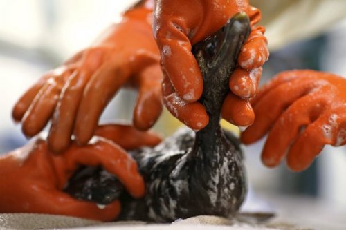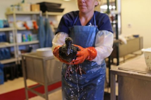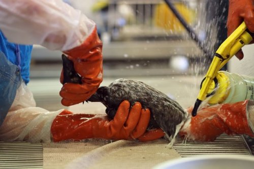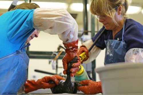 Птицу очищают от загрязнения в Международном центре по спасению птиц в городе Фэйрфилд, штат Калифорния 20 января 2015 года. (Фотография Роберта Гэлбрейта/Reuters)