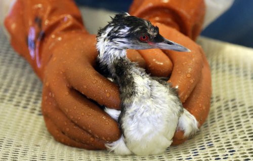 Самку красношейной поганки купают в Международном центре по спасению птиц во вторник, 20 января 2015 года, в городе Фэйрфилд, штат Калифорния. Смерть 100 птиц в районе залива Сан-Франциско озадачила должностных лиц, занимающихся охраной дикой природы, которые говорят, что перья птиц были покрыты загадочным веществом, которое выглядит как резиновый клей и напоминает его по консистенции. (Фотография Марсио Хосе Санчеса (Marcio Jose Sanchez)/AP Photo)