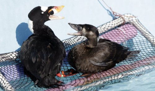 Самец (слева) и самка пестроносого турпана общаются после того, как их подлечили, помыли и высушили в Международном центре по спасению птиц, во вторник, 20 января 2015 года, в городе Фэйрфилд, штат Калифорния. (Фотография Марсио Хосе Санчеса/AP Photo)