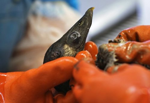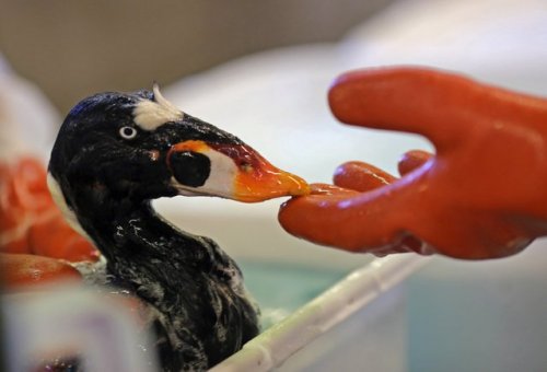 Птицу очищают от загрязнения в Международном центре по спасению птиц в городе Фэйрфилд (Fairfield), штат Калифорния 20 января 2015 года. (Фотография Роберта Гэлбрейта (Robert Galbraith)/Reuters)