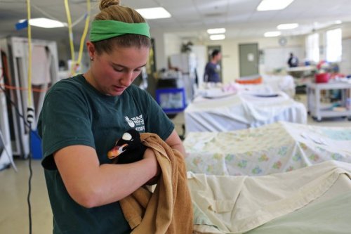 Волонтёр проверяет состояние птицы после того, как её почистили в Международном центре по спасению птиц в городе Фэйрфилд, штат Калифорния 20 января 2015 года. (Фотография Роберта Гэлбрейта/Reuters)