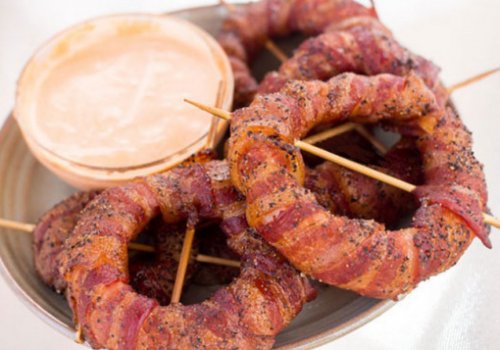 Многие обожают луковые колечки в майонезном соусе, но никто не отказался бы попробовать луковые колечки, завёрнутые в бекон.