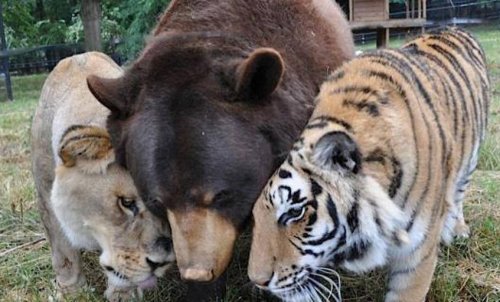 Вряд ли кто-то ожидал увидеть такую занятную троицу, которая в атмосфере дружелюбия коротает дни. Львы, тигры и медведи обычно не пересекаются в природе, поскольку обитают в разных концах света. Эти трое были спасены еще в раннем детстве, около 14 лет назад, и отданы в реабилитационный центр Джорджии под названием Noah’s Arc Sanctuary. Настоящей сенсацией стала новость о том, что эти трое зверят стали неразлучными друзьями.