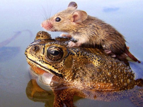 К сожалению, у этой парочки нет имен, поскольку они никому не принадлежат. Этот снимок был сделан в Индии, когда лягушка заметила, что маленькая крыса не может сама перебраться на другую сторону пруда в Лакхнау. Она наверняка утонула бы, если бы не своевременная помощь со стороны лягушки, которая бросилась ей на помощь и перевезла ее на другую сторону пруда.