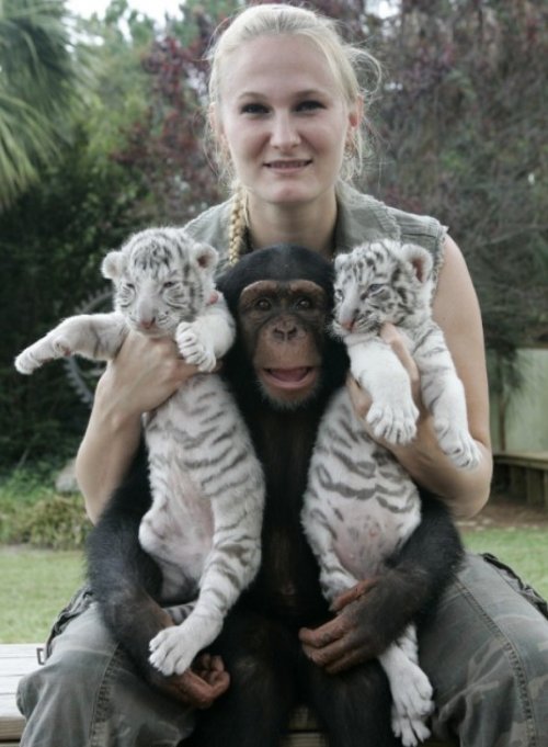 Первое время тигрятам был необходим присмотр и забота, поэтому их поместили к шимпанзе по кличке Анджана. Шимпанзе очень быстро привязалась к тигрятам и с тех пор это трио неразлучно.