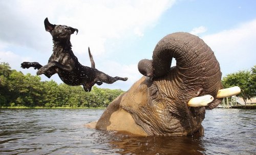 Баблз живет в этом парке еще с 1983 года. Когда слону решили построить бассейн, этим вопросом занялся подрядчик, который в конце решил оставить своего лабрадора здесь же. С тех пор эти двое – неразлучные друзья.