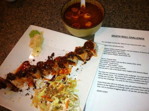 Заведение «Superb Sushi» предлагает три различных пищевых вызова, самым сложным из которых, определённо, является «Смертельный Ролл». Чтобы преуспеть в этом наполненном огнём безумии, вам нужно будет скушать миску «мисосиру из Ада» (miso soup from Hell), в который входит по столовой ложке порошка васаби, соуса Срирача (Sriracha sauce), Смертельного Соуса «Огненная Дорожка» ("Hot Streak" Death Sauce), кайенского перца и их особенного соуса «Дьявольская Кровь» (Demons Blood), а также свежего перца Хабанеро.