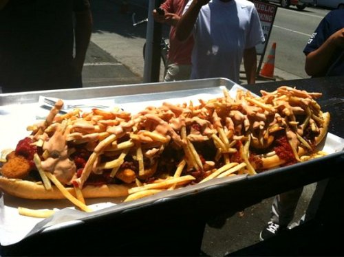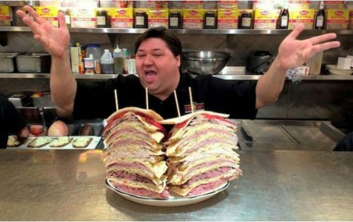 Так что же входит в этот монструозный сэндвич? Сырный стейк, чизбургеры, пастрома, бекон, куриные палочки, моцарелла, жареные яйца, фаршированные перцы халапеньо, луковые кольца, чили, соус маринара и Жирный Соус. Из 800 людей, которые отважились принять этот невероятный вызов, лишь двум профессиональным едокам удалось закончить сэндвич вовремя.