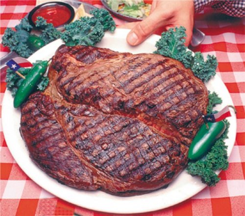 В мире существует огромное количество примеров еды на спор, которые подразумевают поедание огромного стейка, однако самым легендарным из них является вызов заведения «The Big Texan Steak Ranch». Согласно правилам этого заведения, вы должны скушать не только 2-килограммовый стейк, то также и сайку со сливочным маслом, креветочный коктейль, запечённую картофелину, бобы и салат.