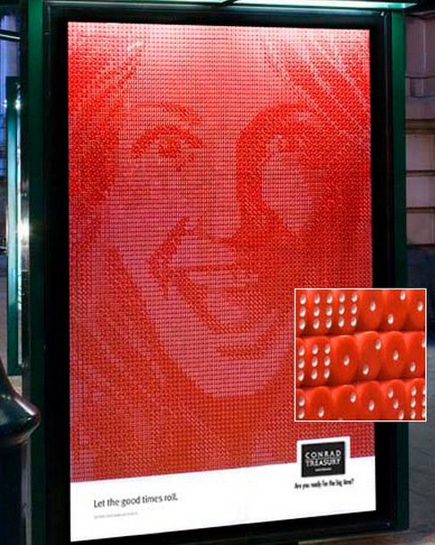 К сожалению, мы не знаем, кто является автором этого произведения искусства, однако этот щит наружной рекламы на самом деле сделан из игральных костей. Может, это и выглядит как картинка, но это и делает это произведение из игральных костей настолько особенным.