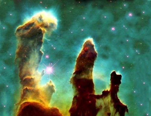 Столпы Творения, напоминающие картину из научно-фантастического пейзажа, на самом деле являются фотографией, сделанной космическим телескопом Хаббл в туманности Орла, расположенной в 7000 световых годах от Земли. Столпы, состоящие из охлаждённого молекулярного водорода и пыли, по сути, являются семенами новых звёзд.