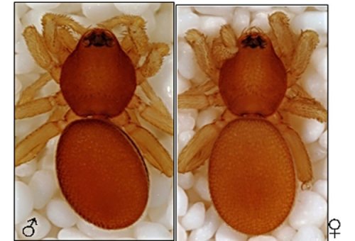Исследователи в Мадагаскаре недавно отпраздновали открытие пяти новых видов крошечных мерцающих пауков. Длина тела этих маленьких мерцающих паукообразных варьирует от 1 до 3 миллиметров. Их даже выделили в отдельный род под названием Volborattella, на основании их уникальной внешности, включая гениталии, не похожие на гениталии их ближайших родственников. А вы сможете разглядеть разницу между полами пауков, изображённых на фотографии?