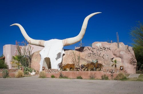 Если вы будете проездом в городе Амадо (Amado), штат Аризона, вы возможно заметите огромный череп коровы. Это не мираж, посреди пустынного города на самом деле находится огромный череп коровы. Заведение «Longhorn Bar & Grill» используется самый огромный череп коровы в качестве входа в ресторан. Это место даже использовалось для сьёмок хорошо известных фильмов. Череп является популярной туристической достопримечательностью и был построен в 1970-ых годах. Высота рогов черепа составляет 9 метров. За черепом находится здание и офисные помещения, в которых на протяжении многих лет располагались различные типы бизнеса. Поэтому, если вы когда-нибудь отправитесь на Запад, обязательно посетите Амадо, скушайте стейк и полюбуйтесь на огромный коровий череп.