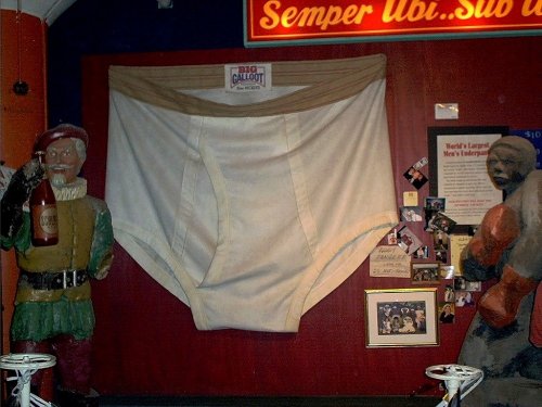 Оно находится в городе Сент-Луис (St Louis) в штате Миссури. В городском музее располагается самая крупная пара трусов в мире. Обхват талии этих трусов составляет 20 метров, а высота от пояса до промежности равна 12 метрам. Вот это да! Трусы были временно изъяты из музея, но были возвращены «постиранными и сложенными», как сообщается на страничке музея на Facebook. Предположительно, к этим трусам ещё шли кружевные дамские шортики, но о них ничего не известно. Остаётся загадкой тот факт, почему какой-либо музей захотел выставлять на всеобщее обозрение огромную пару трусов, будем просто надеяться, что мы никогда не повстречаемся с их владельцем.