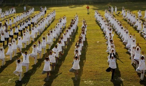 Премьер-министр Индии Нарендра Моди во время массового занятия йогой на проспекте Раджпатх в Нью-Дели, в котором приняли участие 36.000 человек. 21 июня, в первый Международный день йоги, Индия установила мировой рекорд по количеству людей, занимающихся йогой в одном месте.