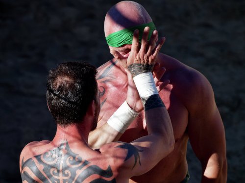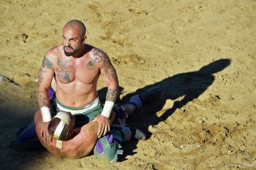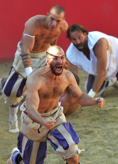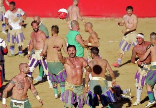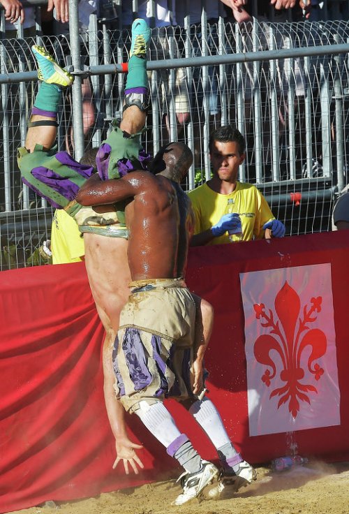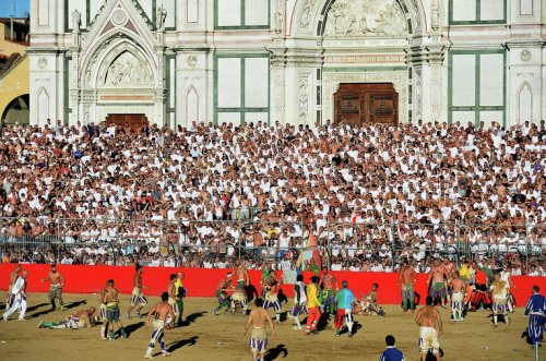 Флорентийский кальчо (в переводе на русский язык слово "calcio" означает "пинок") проводится на песчаном поле площадью 50 на 100 метров. Игроки выходят на поле в штанах по моде XVI века, при этом торс остаётся голым: эти традиции сохраняются уже несколько веков.