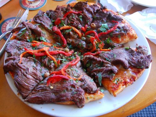 Пицца "Пулькоги" делается из жареной маринованной говядины, сыра, томатного соуса, грибов, болгарских перцев и кимчхи.