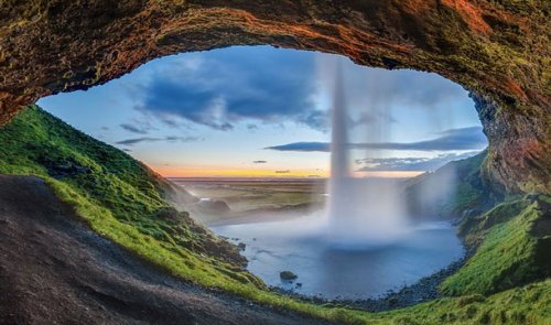Невероятно живописный водопад в Исландии. Для того, чтобы насладиться поразительными пейзажами можно прогуляться позади него.