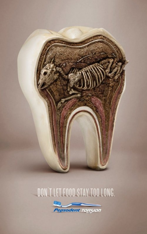 Реклама зубных щёток Pepsodent: "Не оставляйте еду во рту надолго".