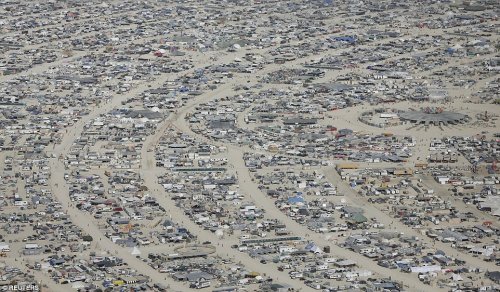 Кажущийся вблизи беспорядочным скоплением палаток и фургонов, с высоты птичьего полёта лагерь выглядит ровным, организованным полукругом, в центре которого установлена скульптура Горящего человека.