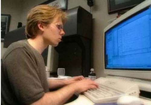 Джон Кармак (John Carmack) пишет код к игре "Quake" на широкоформатном (16:9) 28-дюймовом CRT мониторе