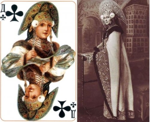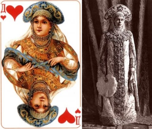 Кто из нас не играл в карты? Все мы отлично помним колоды карт, на которых были эти изображения. Эти фигуры были срисованы с реальных людей, участников бала, состоявшегося в 1903-ем году в Зимнем дворце. Колода под названием "Русский стиль" была создана по немецким эскизам и выпущена в 1911-ом году к 300-летнему юбилею дома Романовых.