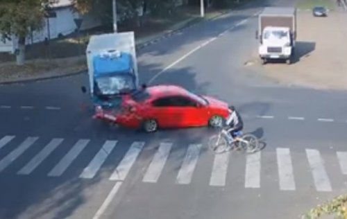 Велосипедист из России оказался зажатым между автомобилем и автофургоном, когда они столкнулись на перекрёстке. Благодаря камерам наблюдения велосипедист, не пострадавший в ДТП, имеет наглядное доказательство своей удачи.